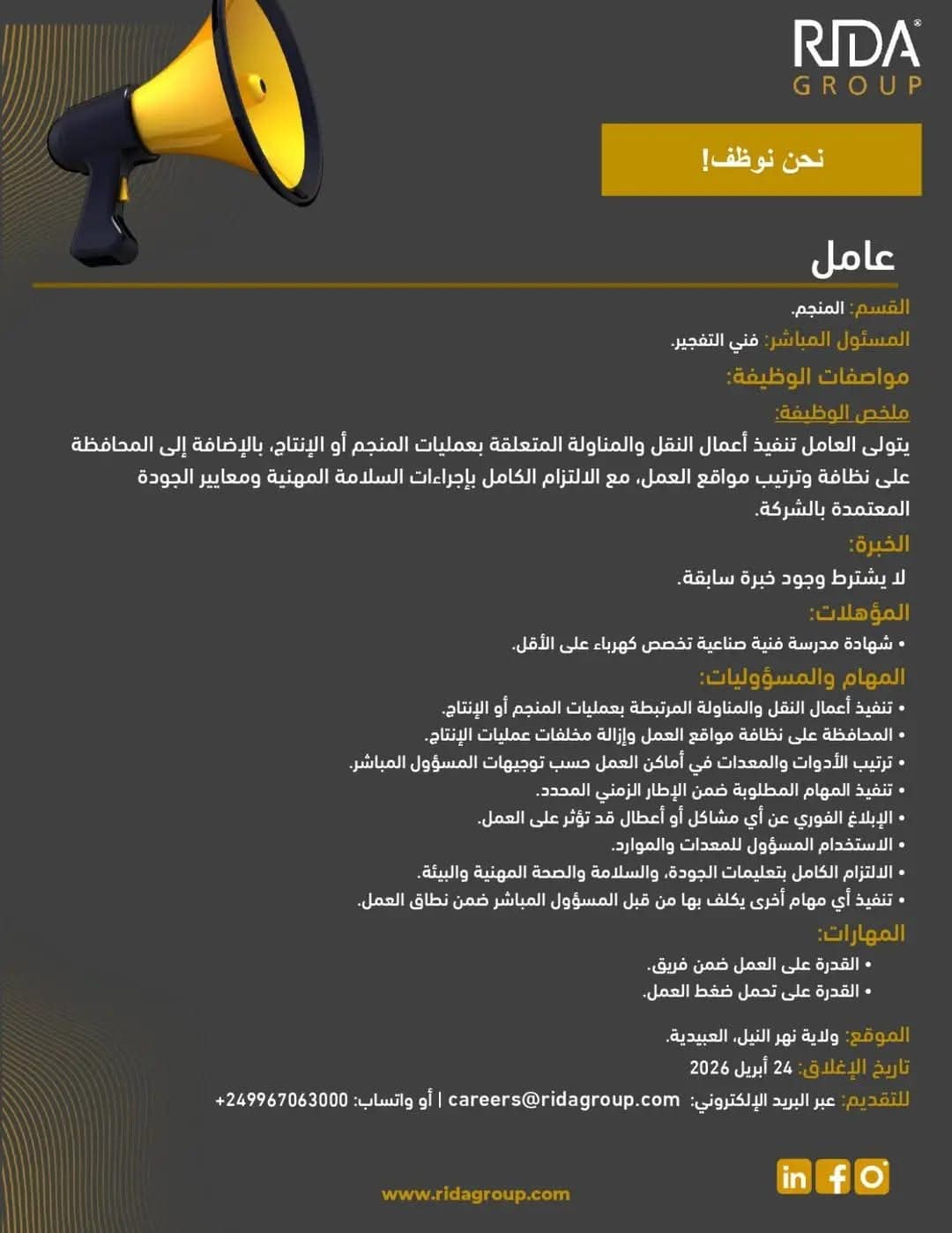 للمهتمين بالتقديم، يُرجى إرسال السيرة الذاتية إلى البريد الإلكتروني: careers@ridagroup.com أو التواصل عبر واتساب على الرقم: +249967063000، وذلك قبل تاريخ 24 أبريل 2026.