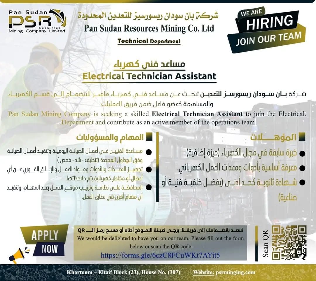 في ظل التوسع المتسارع في قطاع التعدين والحاجة المتزايدة إلى الكوادر الفنية المساندة، تواصل الشركات العاملة في هذا المجال استقطاب الطاقات الشابة القادرة على دعم العمليات التشغيلية وتعزيز كفاءة الأداء. وفي هذا السياق، أعلنت شركة بان سودان ريسورسز للتعدين المحدودة عن فتح باب التقديم لشغل وظيفة مساعد فني كهرباء، للعمل ضمن الإدارة الفنية – قسم الكهرباء.