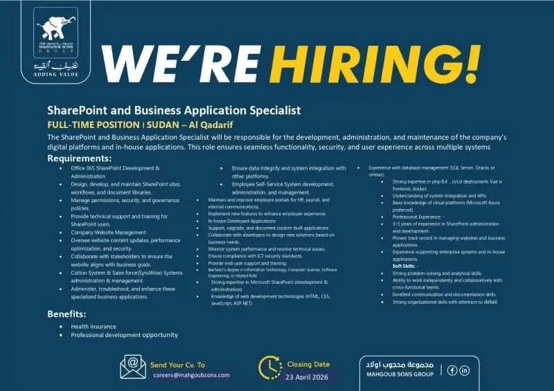 تبحث المجموعة عن مختص في SharePoint وتطبيقات الأعمال، للعمل بدوام كامل في مدينة القضارف، حيث يتطلب الدور التعامل مع الأنظمة الرقمية وإدارة التطبيقات المؤسسية، إلى جانب تقديم حلول تقنية تدعم احتياجات الأقسام المختلفة.