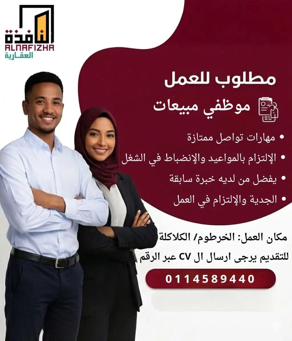 وفي هذا السياق، أُعلنت فرصة عمل للانضمام إلى فريق مبيعات يعمل في مجال العقارات بمدينة الخرطوم، حيث تستهدف هذه الفرصة استقطاب أفراد طموحين يمتلكون الرغبة في النجاح والقدرة على تحقيق الأهداف البيعية.