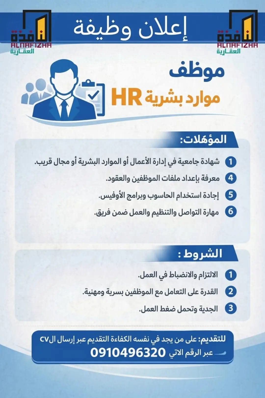 للمهتمين بالتقديم، يرجى إرسال السيرة الذاتية عبر واتساب على الرقم التالي: 0910496320.