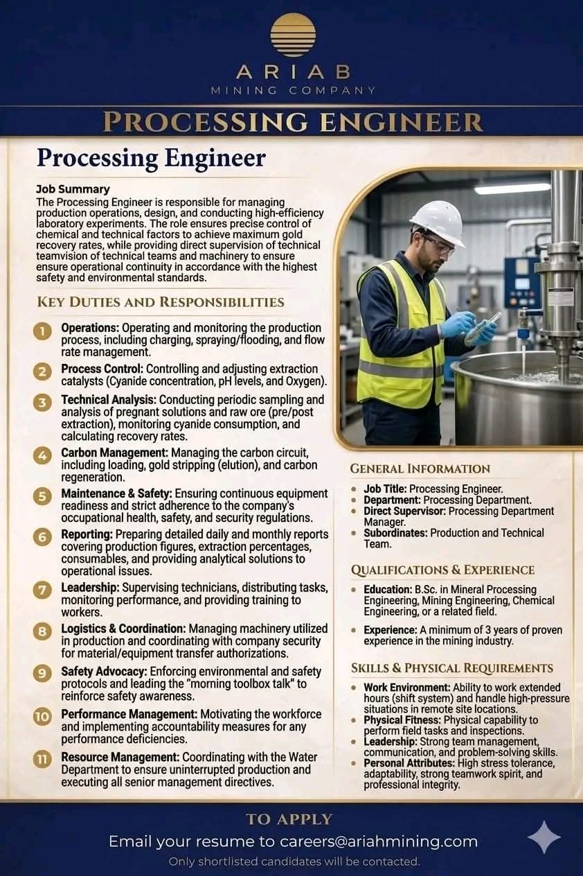 وتعكس هذه الفرصة أهمية الدور الذي يلعبه مهندس المعالجة في تحقيق أعلى معدلات الإنتاج، خاصة في الصناعات المرتبطة باستخلاص المعادن مثل الذهب.