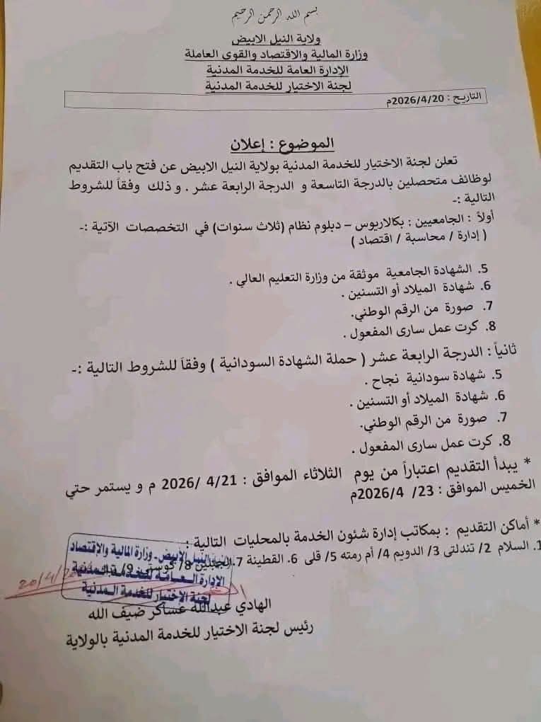 في خطوة تعكس سعي المؤسسات الحكومية إلى تعزيز كفاءة الجهاز الإداري وفتح فرص أمام الكوادر الوطنية، أعلنت لجنة الاختيار للخدمة المدنية بولاية النيل الأبيض عن فتح باب التقديم لوظائف “متحصلين” ضمن الدرجتين التاسعة والرابعة عشر، وذلك لفترة محدودة تستهدف استقطاب خريجين وشباب مؤهلين للانخراط في سوق العمل الحكومي.