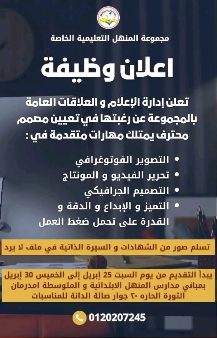 في قلب مدينة أم درمان، حيث يتقاطع التاريخ مع الحاضر وتستمر مسيرة التعليم رغم التحديات، تواصل المؤسسات التعليمية الخاصة دورها في دعم الكفاءات الشابة وفتح آفاق جديدة للإبداع والتميز. وفي هذا السياق، أعلنت مجموعة المنهل التعليمية الخاصة عن توفر فرصة عمل ضمن إدارة الإعلام والعلاقات العامة، في خطوة تعكس اهتمامها بتعزيز حضورها الإعلامي وتطوير محتواها البصري.