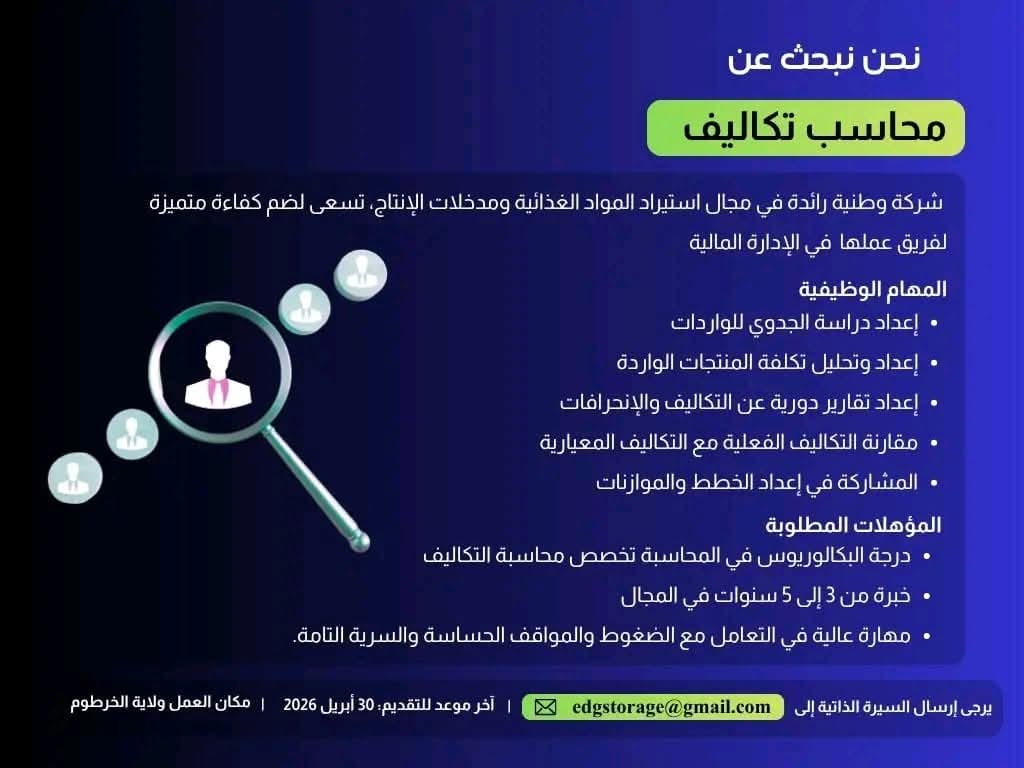 شركة وطنية في الخرطوم تعلن عن وظيفة محاسب تكاليف ضمن الإدارة المالية