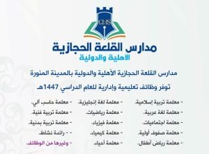 الكلمات المفتاحية: وظائف تعليمية للنساء 2025، وظائف إدارية في المدينة المنورة، وظائف مدارس خاصة المدينة المنورة، توظيف معلمات المدينة المنورة، مدارس القلعة الحجازية وظائف.