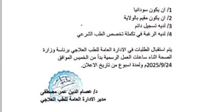 في خطوة لتعزيز الكادر الطبي وضمان جودة الخدمات الصحية، أعلنت وزارة الصحة ولاية كسلا عن حاجتها لتعيين طبيبين للعمل ضمن…