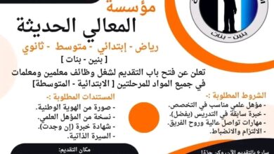 مؤسسة المعالي الحديثة الخاصة تعلن عن وظائف معلمين ومعلمات في جميع المواد