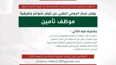 فرصة عمل بمركز الرومي الطبي: وظيفة موظف تأمين بخبرة في المجال