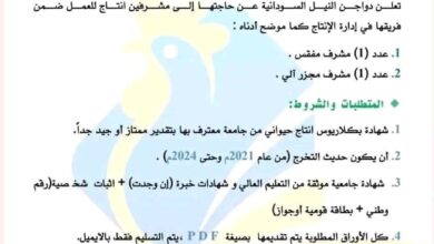 تعلن دواجن النيل السودانية للإنتاج الزراعي والحيواني، التابعة لهيئة تطوير الزراعة بمنطقة سد مروي، عن رغبتها في تعيين مشرفين إنتاج…