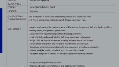 فرصة عمل في الخرطوم: مطلوب مشرف مناوبة مرافق بشركة Mega Food Industries – Pepsi