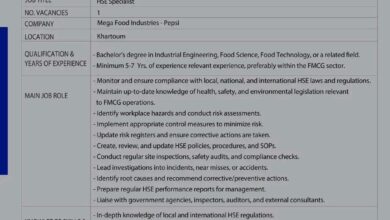 فرصة عمل في الخرطوم: شركة Mega Food Industries – Pepsi تعلن عن وظيفة أخصائي الصحة والسلامة المهنية HSE Specialist
