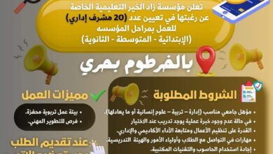 الخرطوم _ الإداري _ الخاص ، يسر مؤسسة زاد الخير التعليمية الخاصة أن تعلن عن رغبتها في تعيين عدد (20…