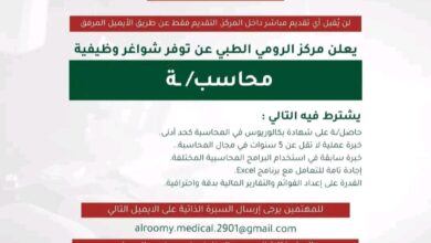 فرصة عمل بمركز الرومي الطبي: وظيفة محاسب/ة بخبرة لا تقل عن خمس سنوات