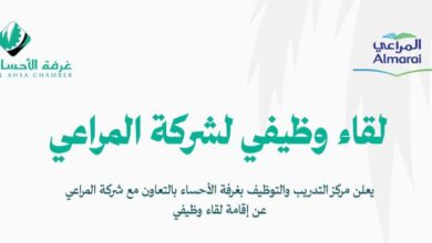 أعلن مركز التدريب والتوظيف بغرفة الأحساء بالتعاون مع شركة المراعي عن إقامة لقاء وظيفي لشغل العديد من الوظائف الشاغرة للعمل في المنطقة الوسطى