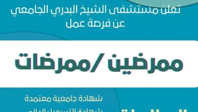 مستشفى الشيخ البدري الجامعي يفتح باب التقديم لوظائف ممرضين وممرضات