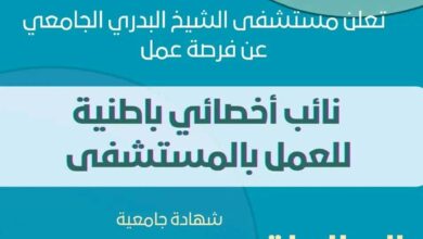 يواصل مستشفى الشيخ البدري الجامعي تعزيز كوادره الطبية، معلنًا عن توفر فرصة وظيفية لنائب أخصائي…